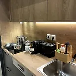 Die Unterkunft ist mit Selbstversorgungseinrichtungen ausgestattet, einschließlich einer Küche mit einer Kaffee-/Teemaschine, einem Kühlschrank und einem Herd.